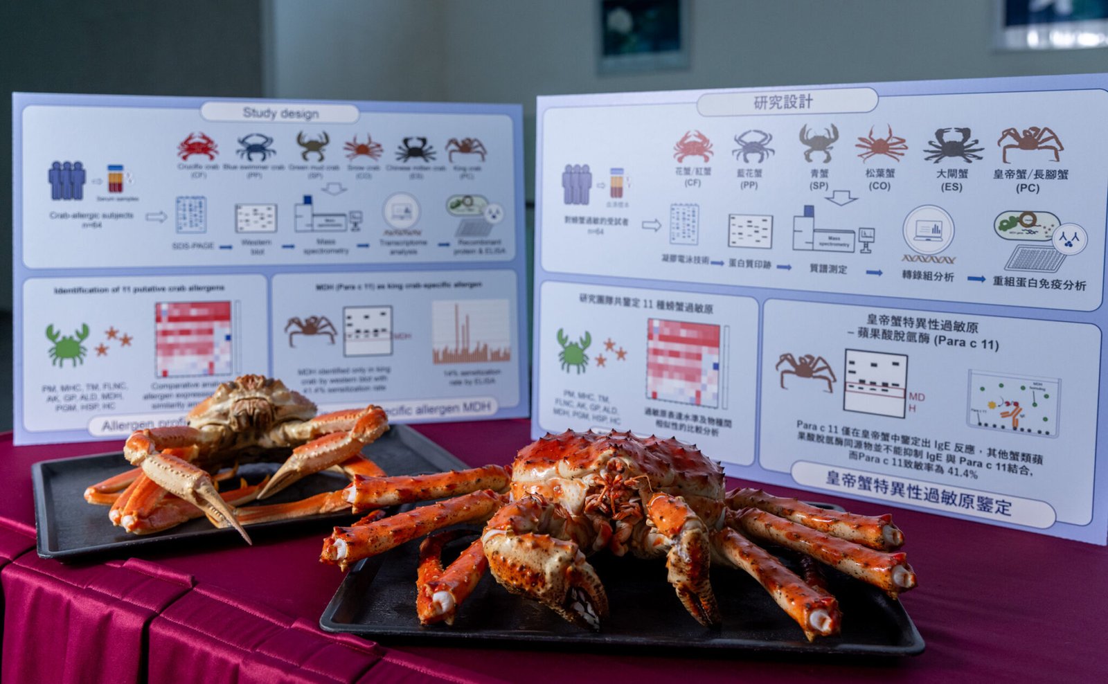 研究團隊分析了64個香港成人和兒童蟹過敏確診個案的血清樣本。所謂蟹過敏,是指在食用蟹之後兩小時內出現過敏反應。團隊檢測了市面上六種最常食用的蟹,包括不是真正「蟹」的皇帝蟹——它由寄居蟹的祖先進化而來,屬於異尾類動物。團隊經過萃取蟹鉗中肌肉蛋白,並鑑定其中可與 IgE 結合的蛋白質,從而鎖定蟹致敏原。